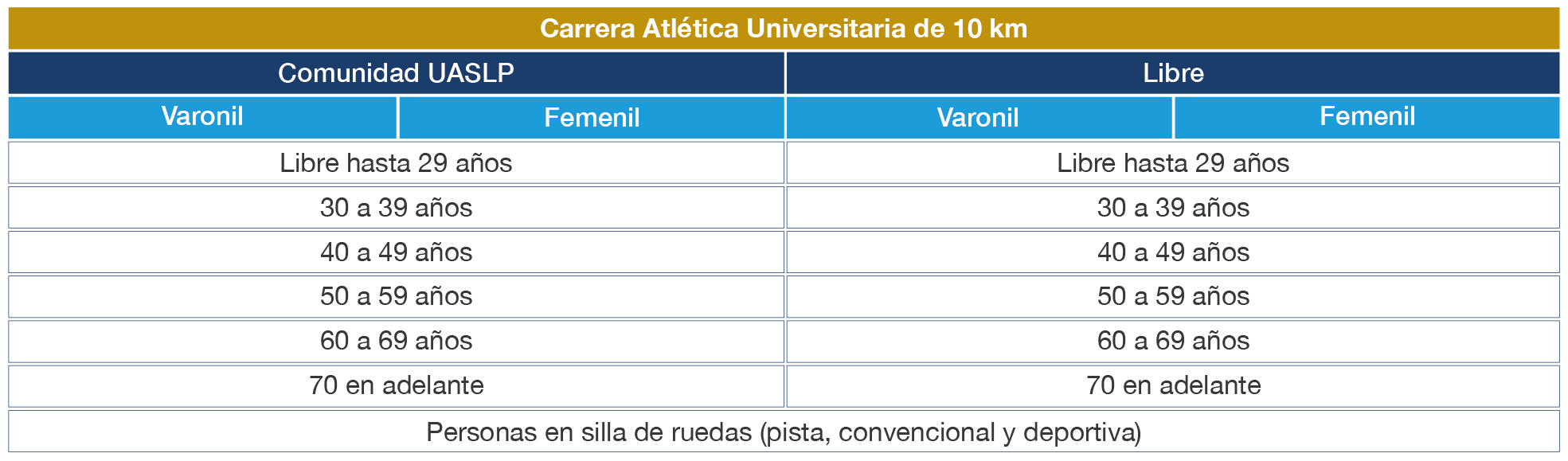 Domingo 28 de septiembre a partir de las 10:30 horas para el Medio Maratón UASLP y la Carrera Atlética de 10 km en la categoría libre y universitaria en rama varonil y femenil.